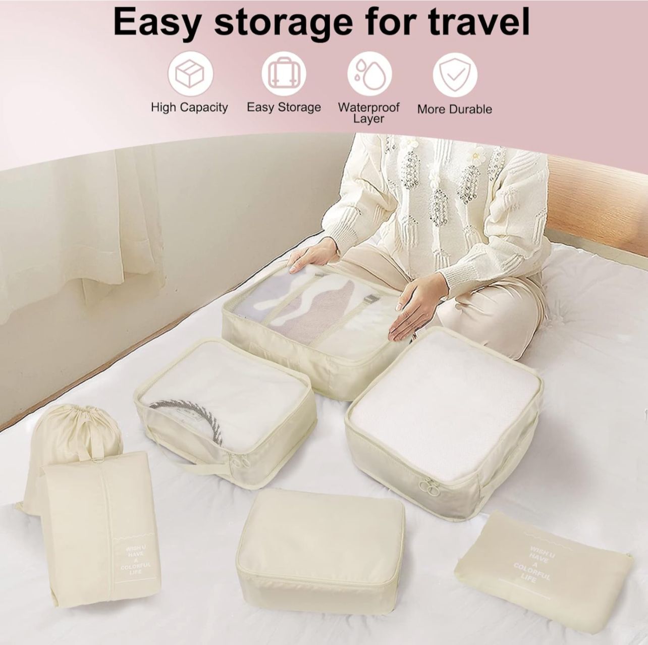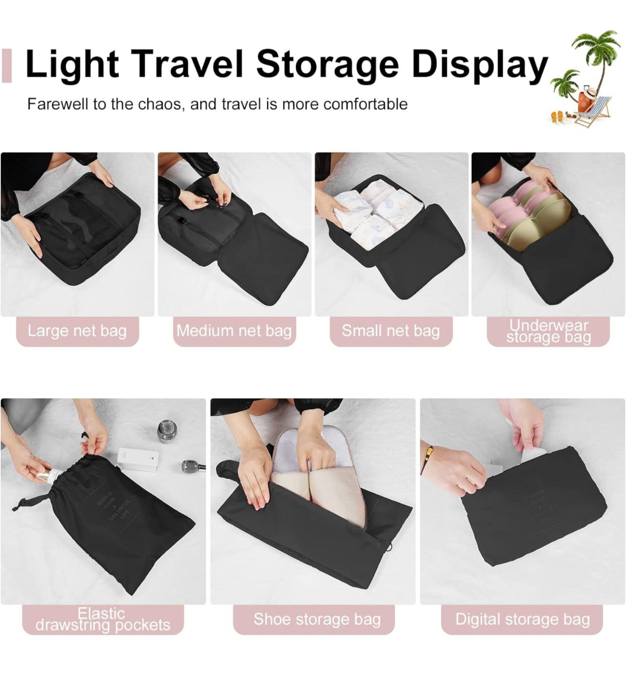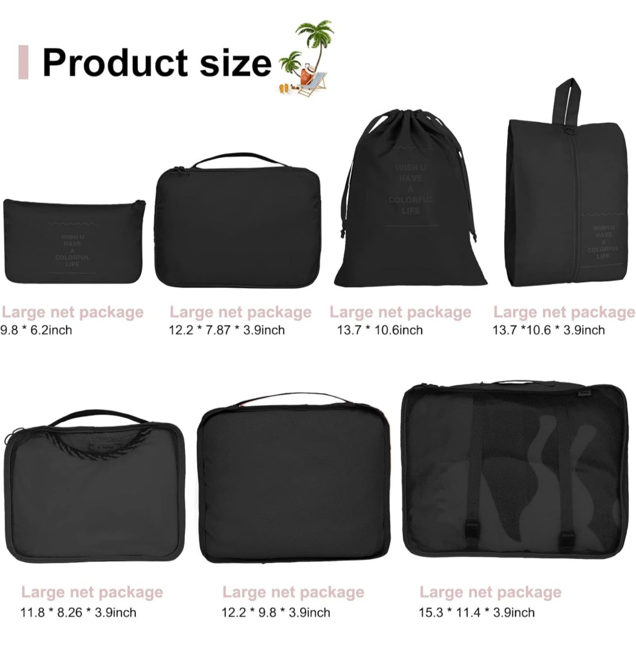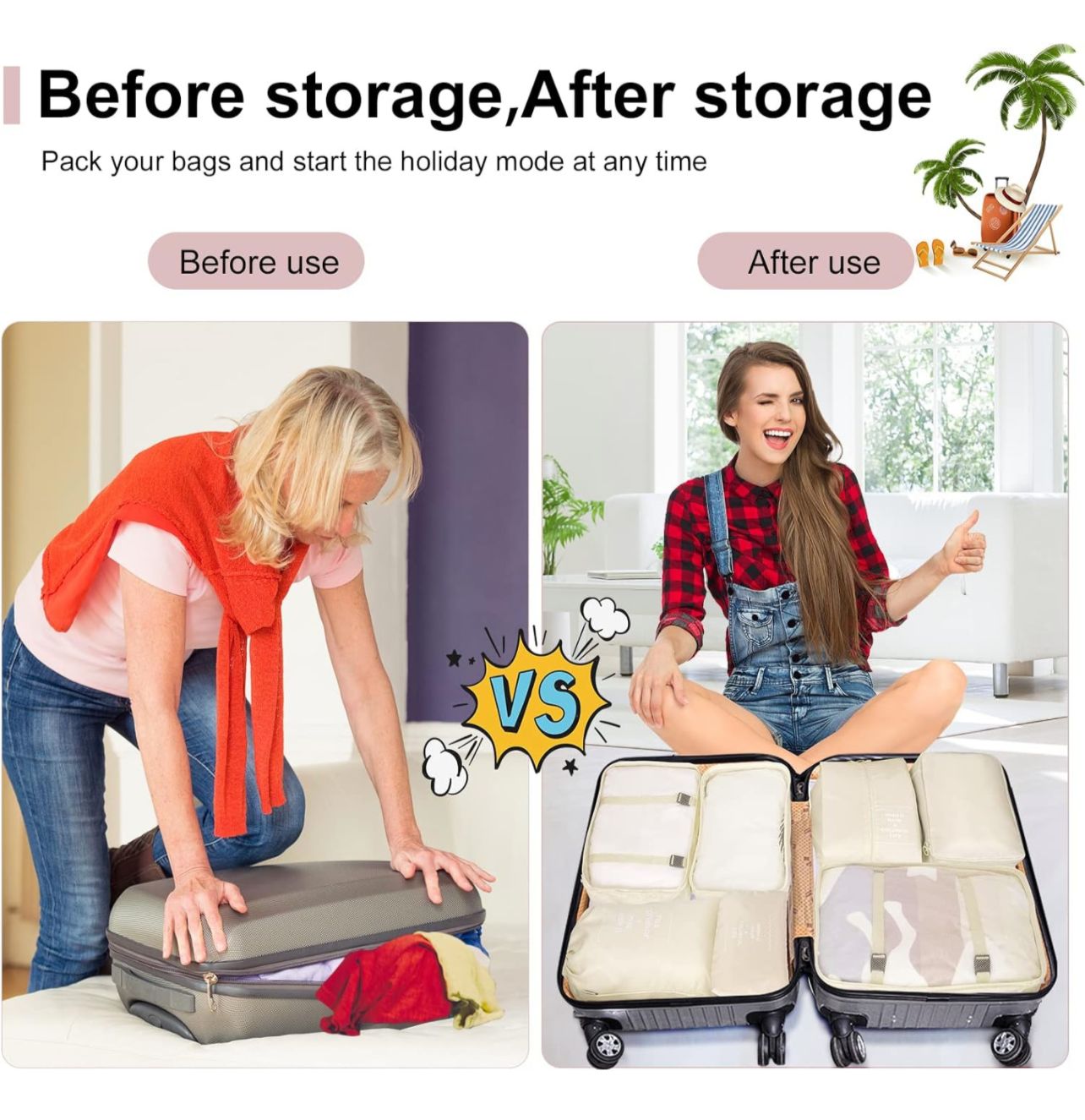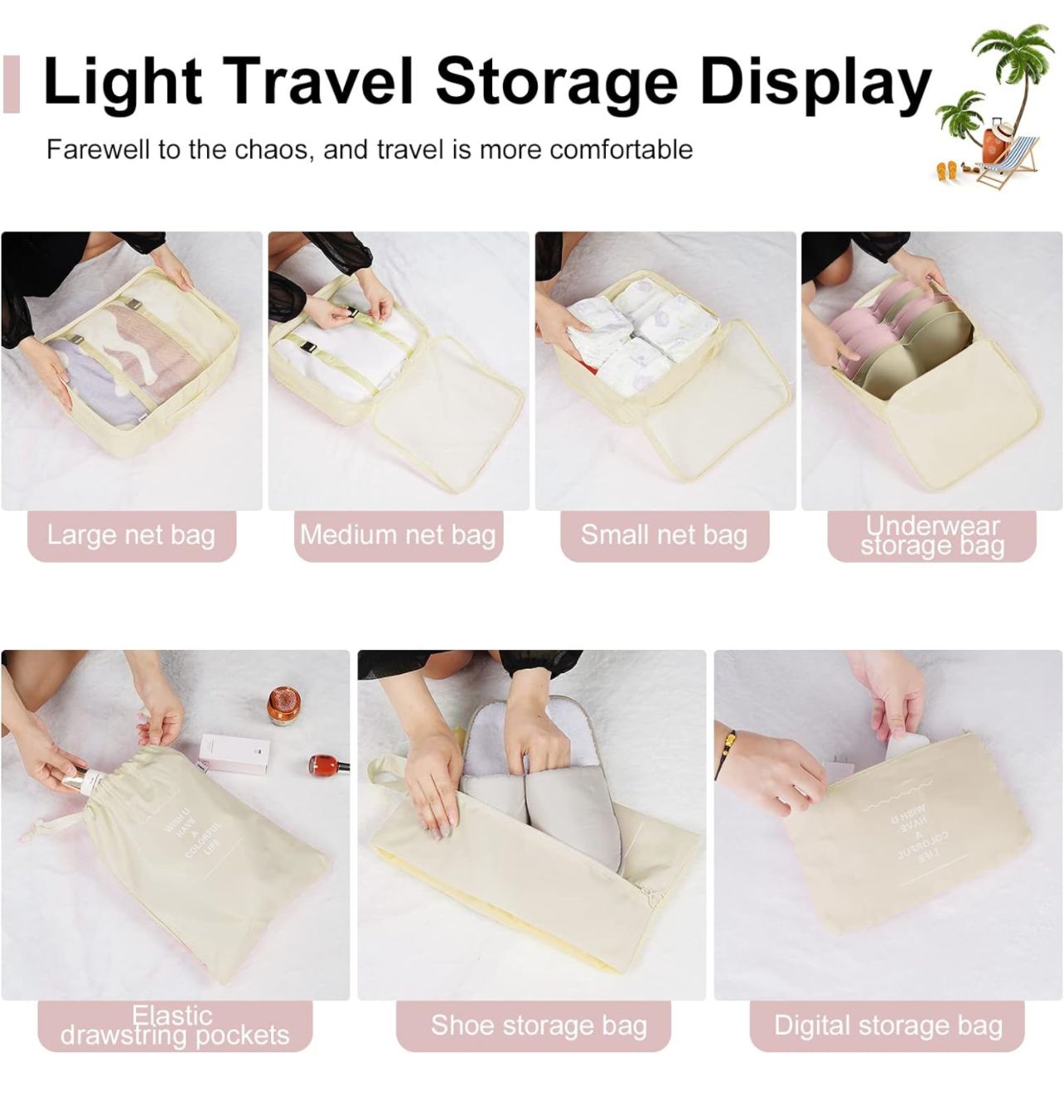 👗【CONVENIENT TRAVEL STORAGE BAG】Our packing bag set includes a new stylish makeup bag, with mesh on the one side, breathable and good to view your items, a new shoes bag, convenient to store and keep your shoes in your travel.