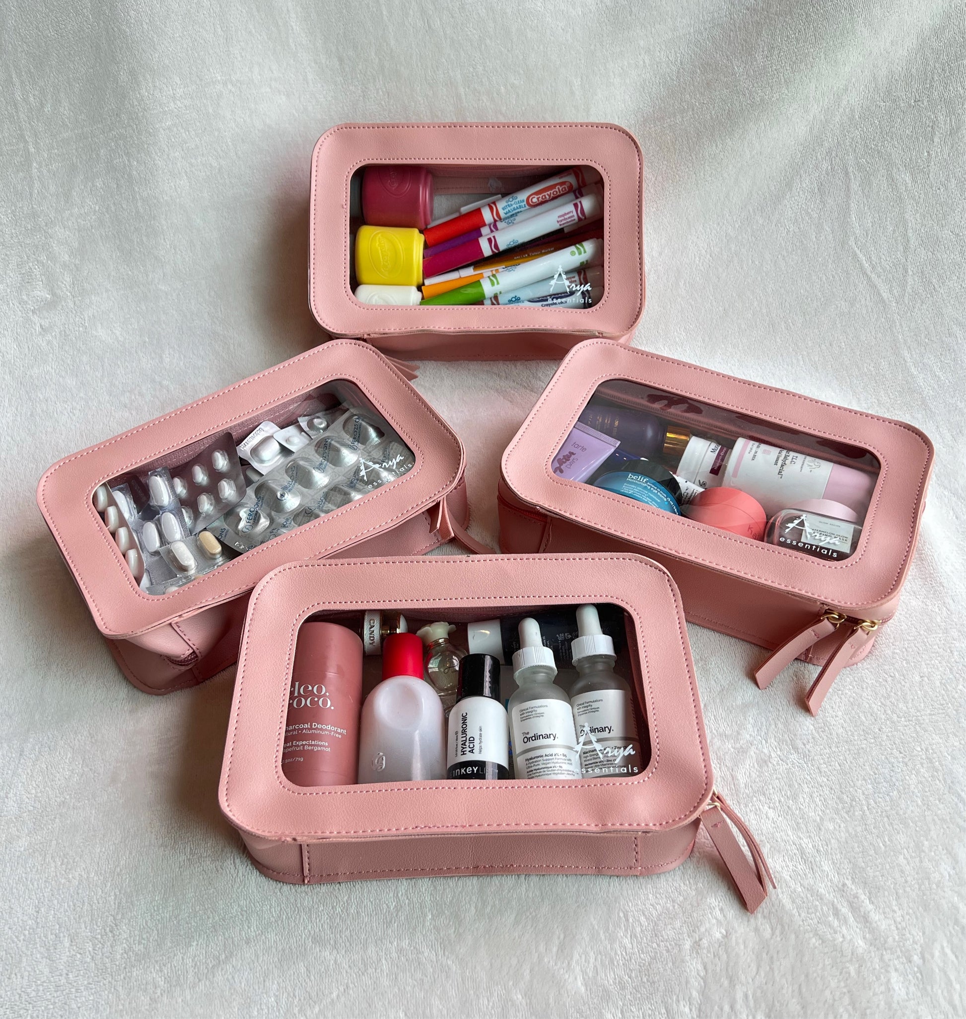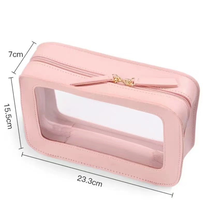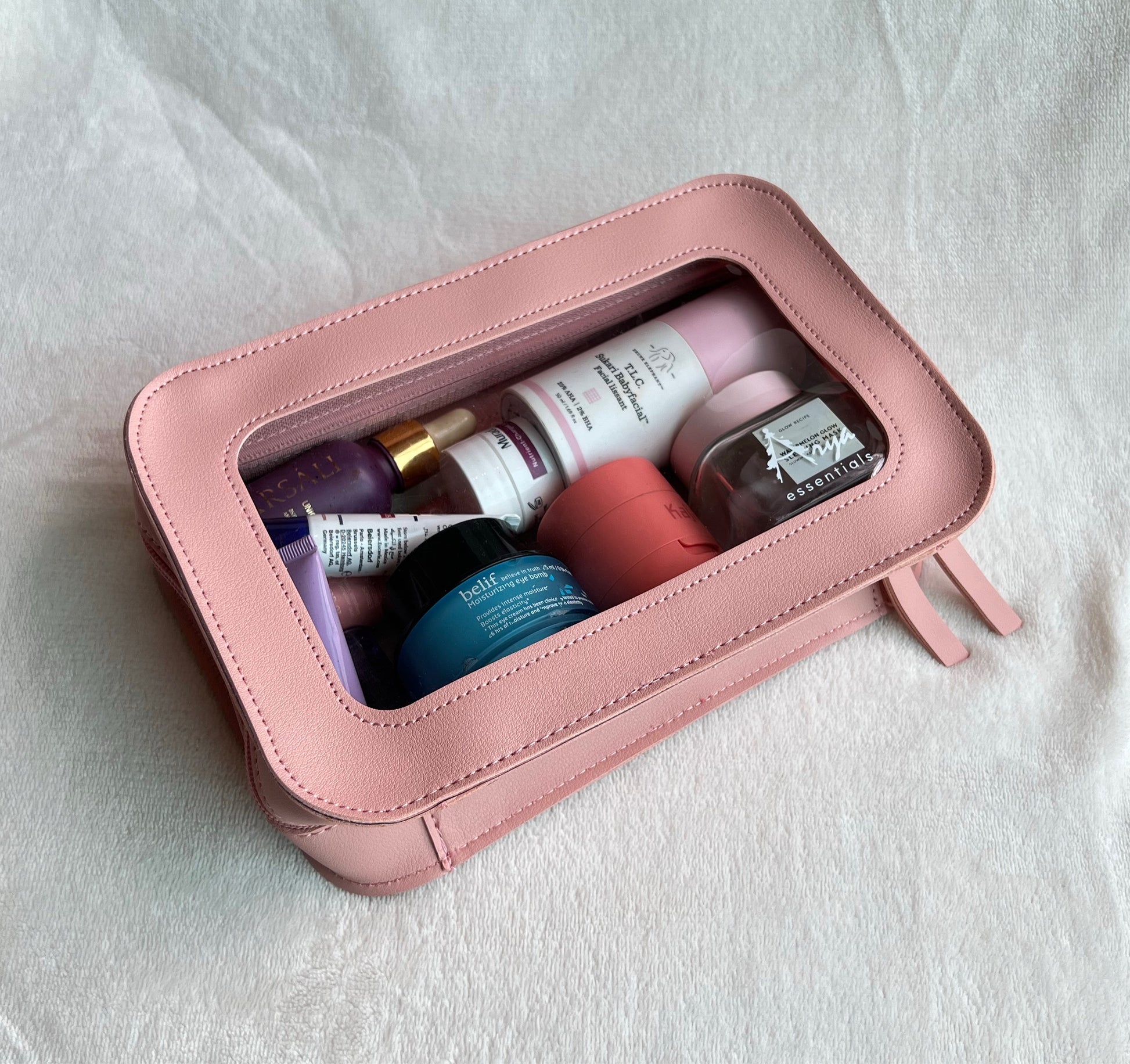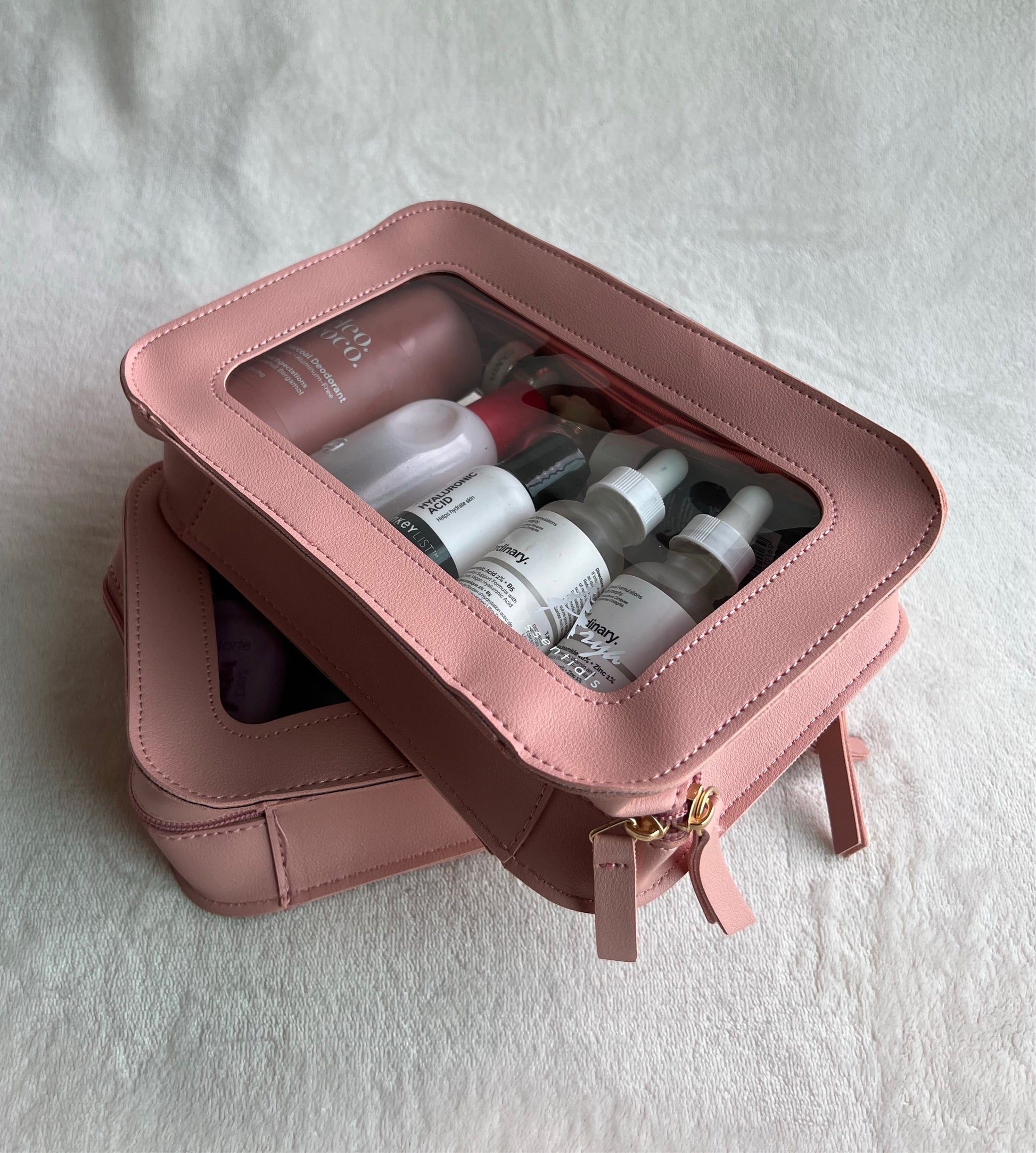 Organize like a pro and never lose sight of your beauty essentials thanks to the transparent panels on both sides. Easy access and no more digging due to clear flap cover on top. Place your brushes, make-up, skincare and hair accessories inside. The perfect travel essential to carry all your smaller liquids and beauty favourites.