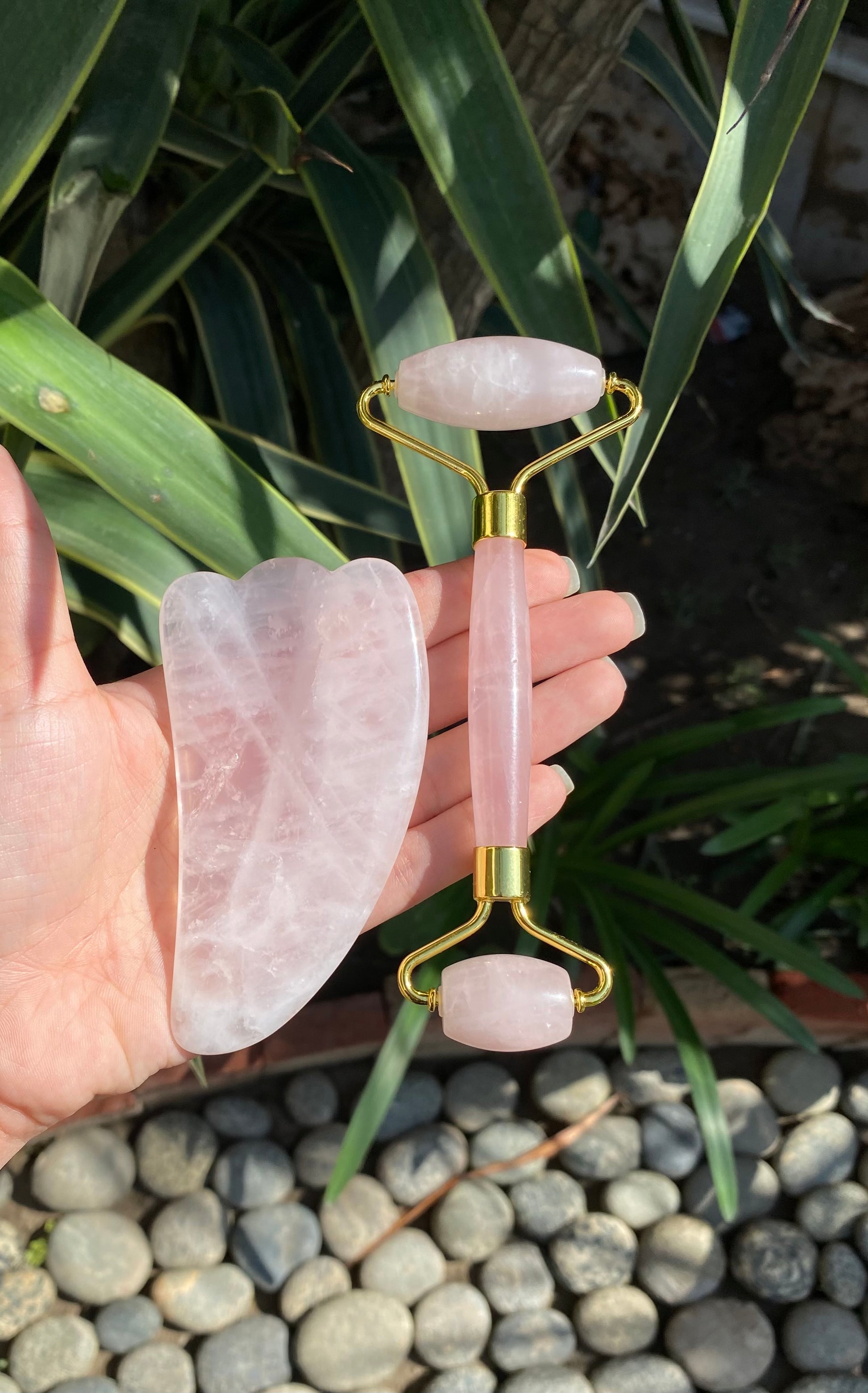 Set of De-Puffing Rose Quartz Facial Roller & The Rose Quartz Gua Sha Facial Lifting Tool